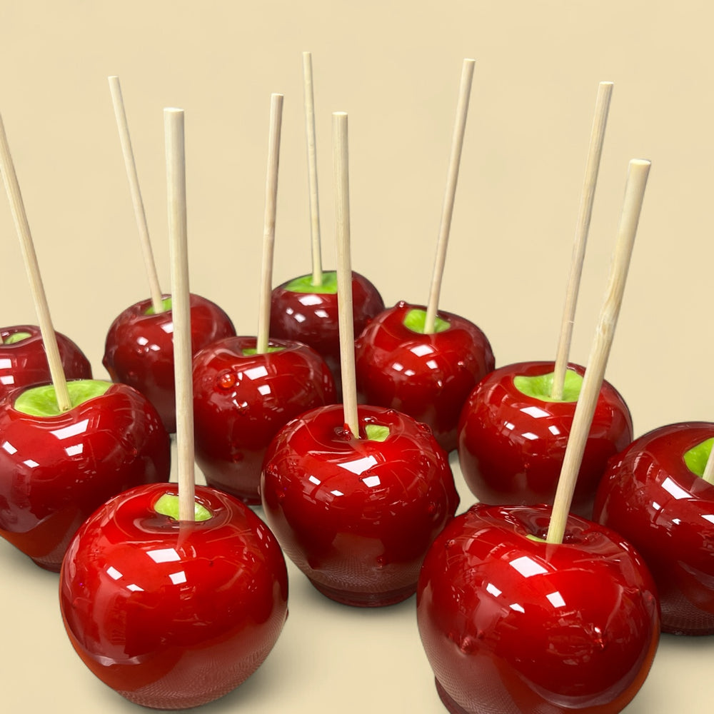 crisp, juicy granny smith apples coated in rich, buttery caramel