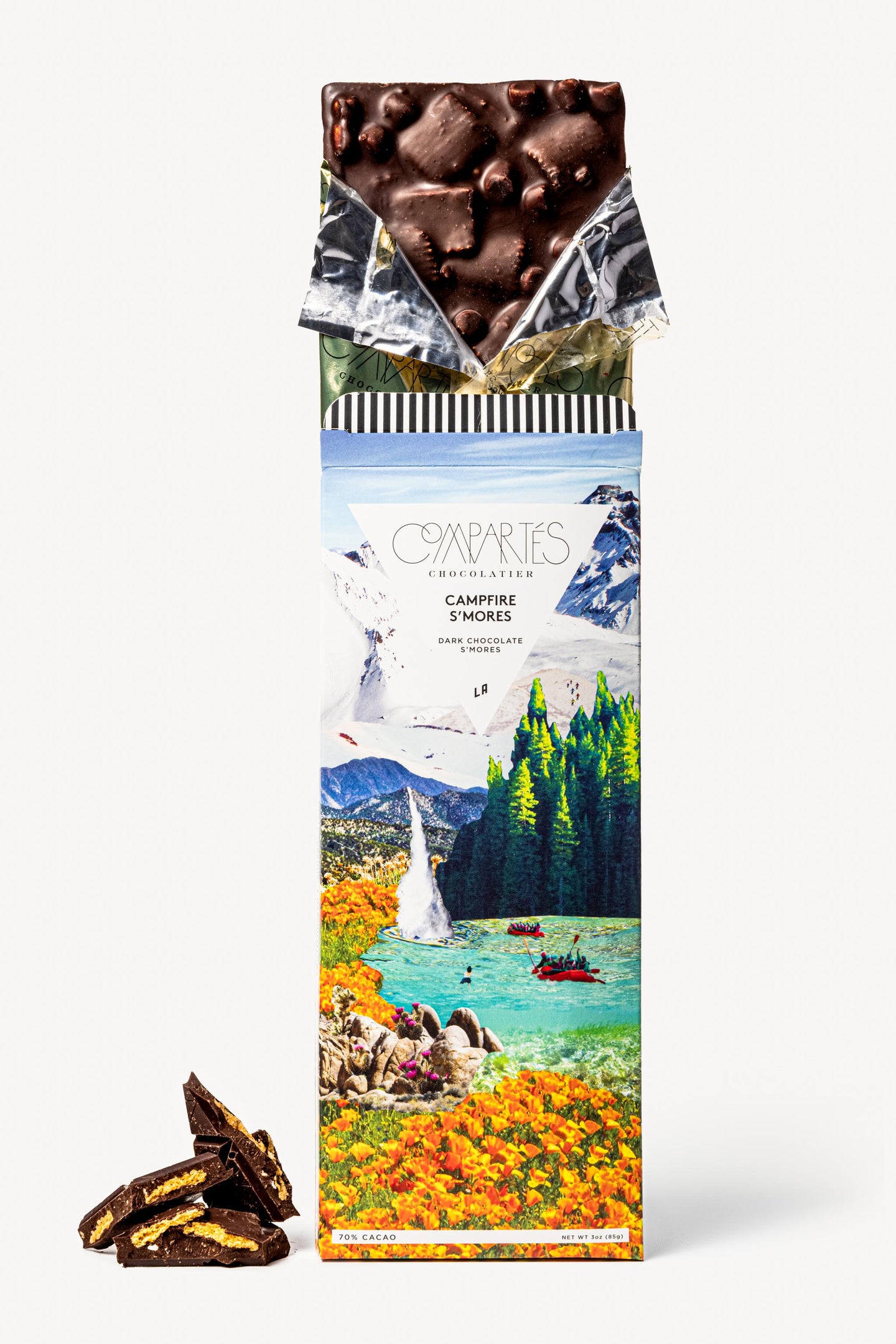 Compartés Campfire S'mores dark chocolate bar is s'mores taken up a notch. We make marshmallows and blend them into our rich signature dark chocolate with bits of graham crackers for a familiar, yet distinctive, flavour sensation. What can be better than chocolate s'mores in chocolate bar form? Featuring a gorgeous design made from over 40 photos that even feature our chocolatier Jonathan Grahm's dogs Samson, Rocco, Grayson, and Sebastian hidden on the back... This bar evokes summertime, campfires, and warmth, and will quickly become a new addition to your summer celebrations. 85g
