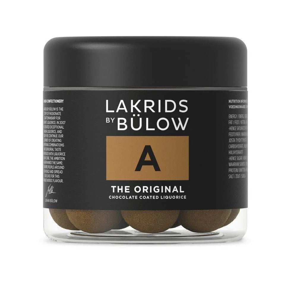A - THE ORIGINAL was the first product developed when Johan Bülow had the original idea to coat liquorice with chocolate. People were at first skeptical about the idea, but the popular product A soon saw the light of day. The combination of sweet liquorice, exclusive milk chocolate and fine liquorice powder is according to many instantly addictive. 125g