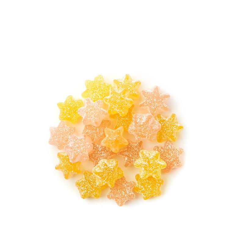 Sugars (sugar, glucose syrup), Water, Pectin, Concentrated lemon juice, Citric acid, Lactic acid, Sodium citrate, Calcium citrate, Malic acid, Sodium malate, Ascorbic acid, Natural colours (turmeric, blackcurrant, black carrot),