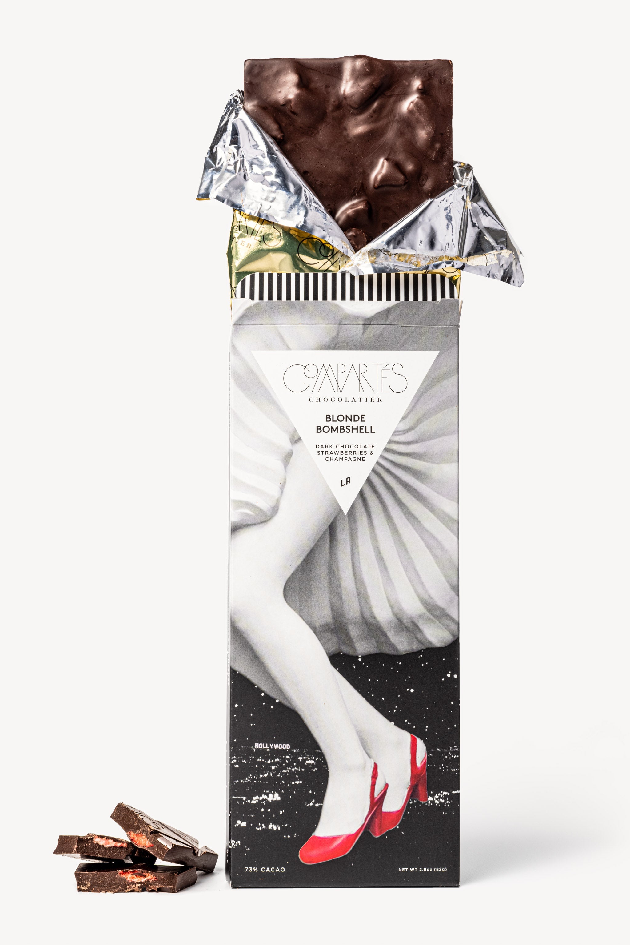 Compartés Blonde Bombshell dark chocolate bar is unlike any other chocolate bar you have ever tried. Dried strawberries and a splash of champagne perfectly compliment to our delicious dark chocolate. Featuring a dazzling cover of the Blonde Bombshell. 82g