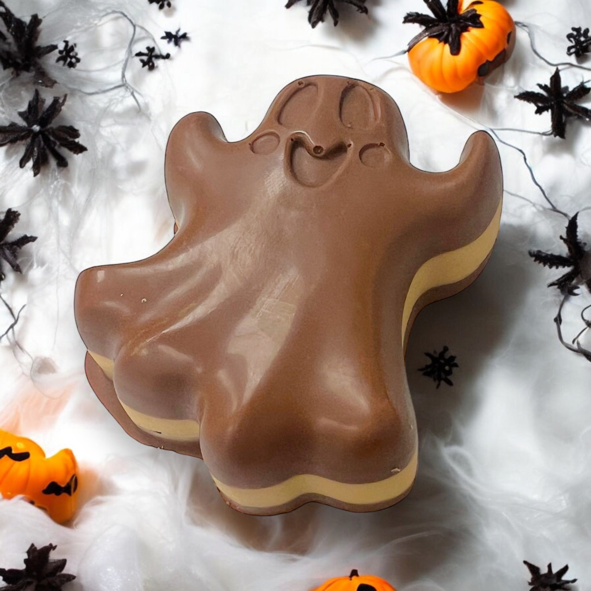 Indulge in our House-Made Chocolate Peanut Butter Ghosts, a whimsical treat perfect for any spooky celebration! Each ghost features a rich, creamy peanut butter filling enveloped in a smooth layer of milk chocolate.
