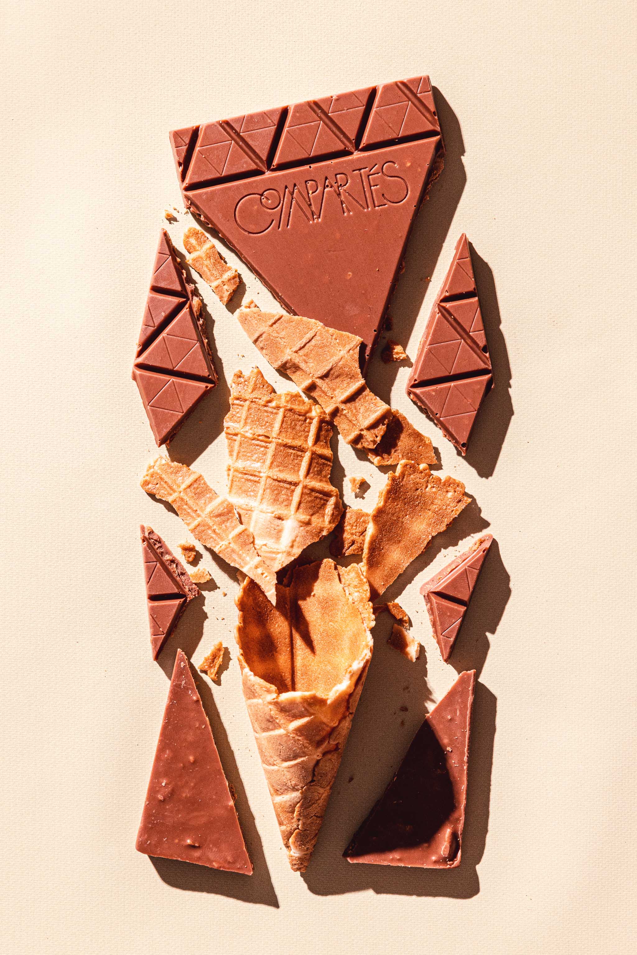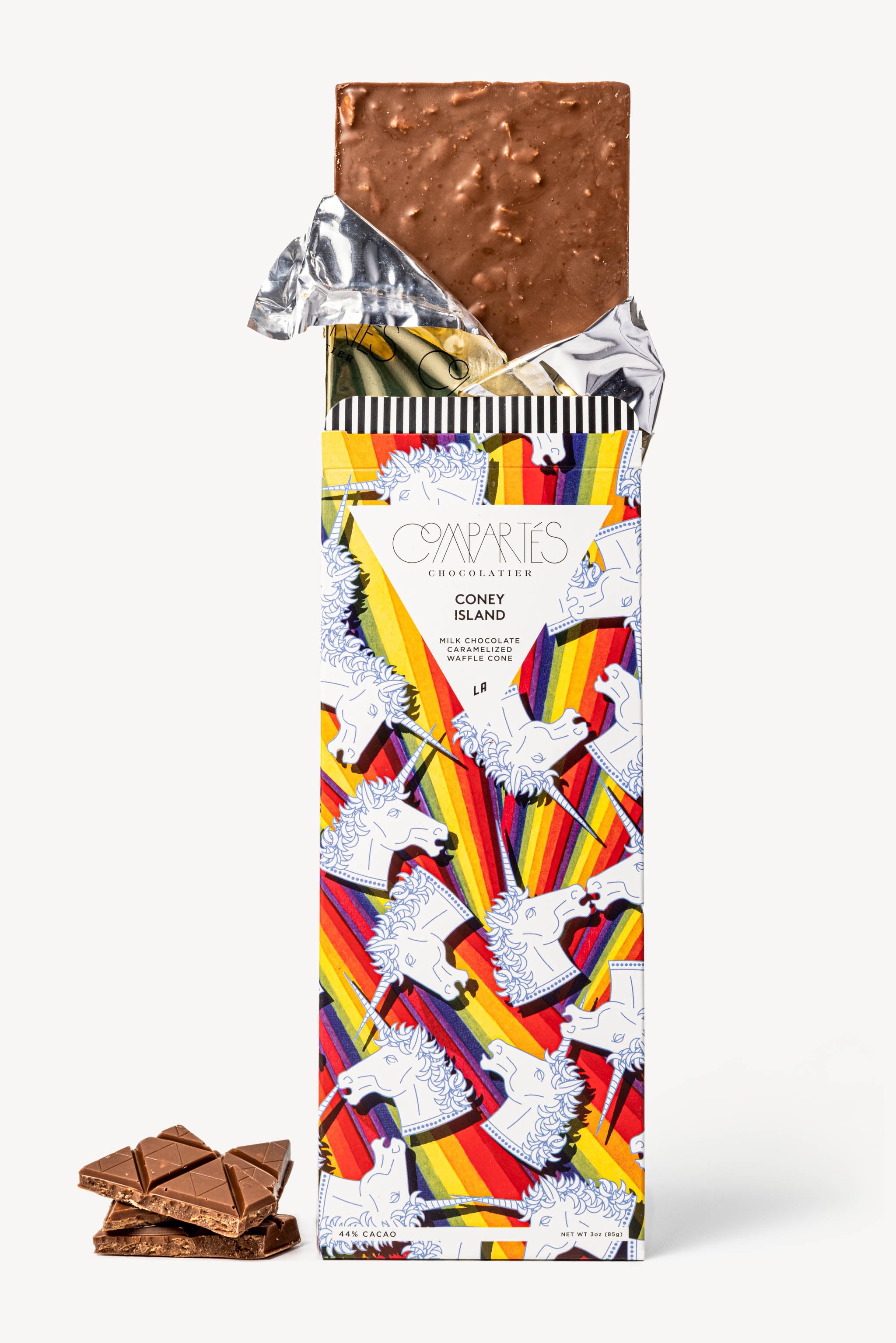 Compartés Coney Island milk chocolate is filled with crispy caramelized waffle cone pieces. This Coney Island chocolate bar is a nostalgic treat like no other and one of our most popular and best selling gourmet chocolate bars. We take Compartés signature creamy milk chocolate and pack it full of caramelized crunchy waffle cone pieces. One bite into this creation and you will feel like you are right on the boardwalk of Coney Island enjoying a fresh ice cream waffle cone! Handmade in our Los Angeles chocolate kitchens! 84g