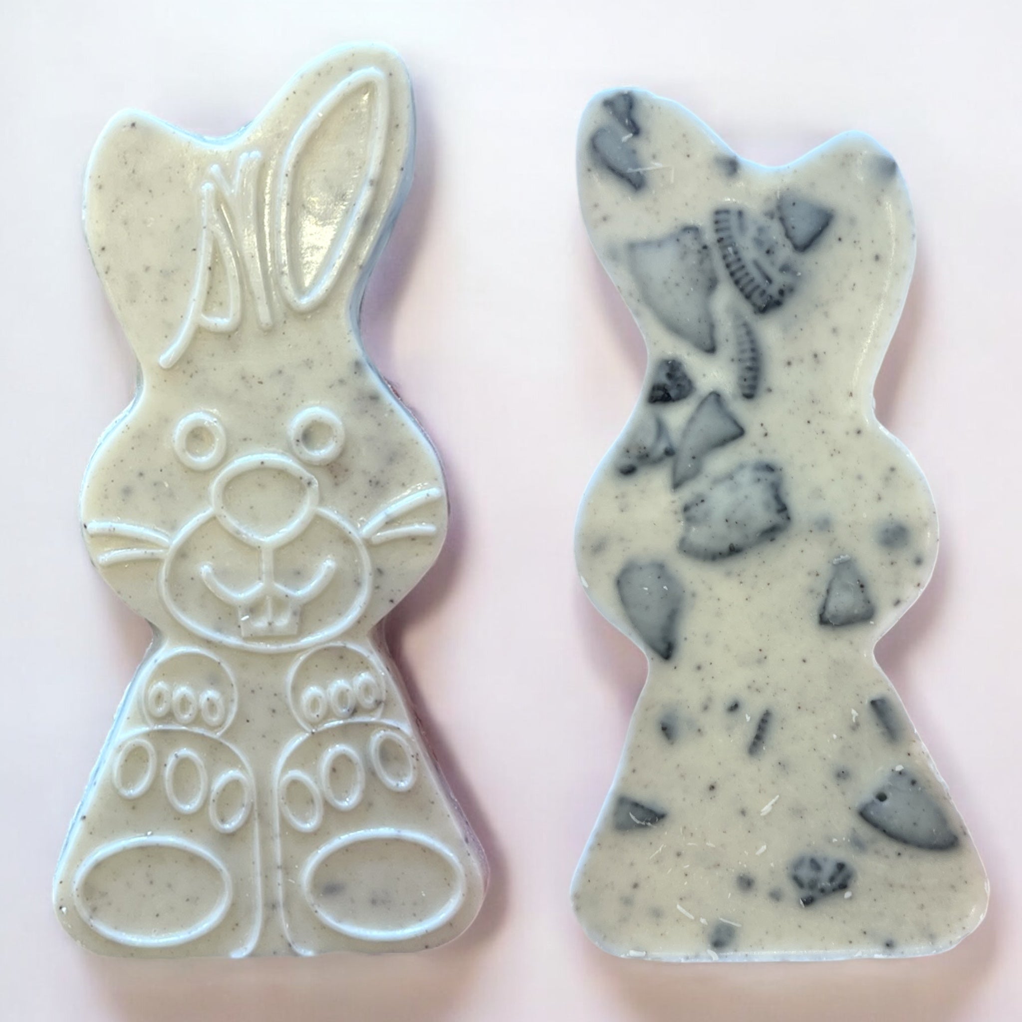 Here is a twist on the Traditional bunny! A Cookies n Cream Bunny! White chocolate with Oreo cookies