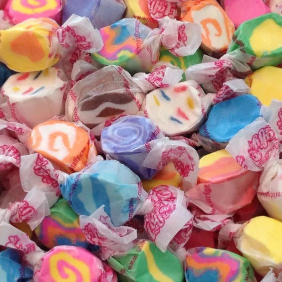 Taffy Town's Assorted Salt Water Taffy. Flavours include Banana, Grape, Orange Cream, Peppermint, Raspberry, Watermelon, Caramel Swirls, Cherry, Chocolate, Green Apple, Licorice Swirls, Neapolitan, Cinnamon, Root Beer Float, and Vanilla. It is a delicious whipped taffy that melts in your mouth with a wide variety of true to life, unique, and amazing flavours. It’s a colourful product with individual wrapping to make it easy to use in candy buffets, holiday treats, summer snacks, party goody bags, and more.