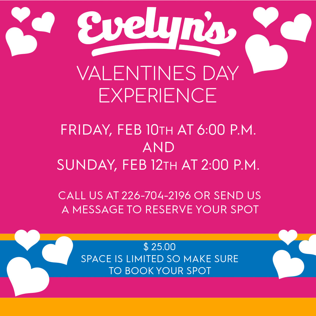 We hope you can join us for Evelyn’s Valentine’s Day Experience💗🍫 Come for this fun night of Sweets, Treats and Chocolate Designing! Each guest will create a fantastic and unique piece of chocolate, fill a delicious candy bag and to make a personalized card that will brighten anyone’s Valentine’s Day! Delight your partner, parent, grandparent or teacher🍫🍭❤️