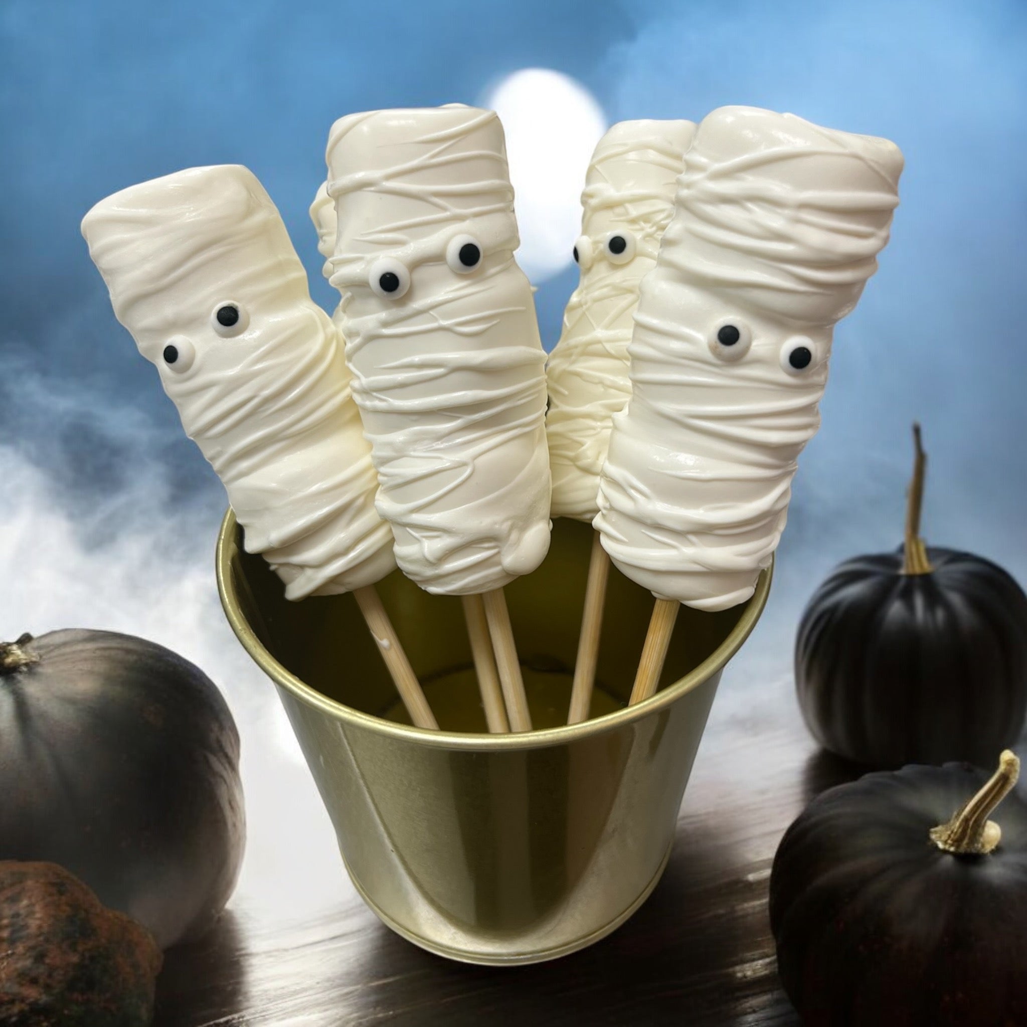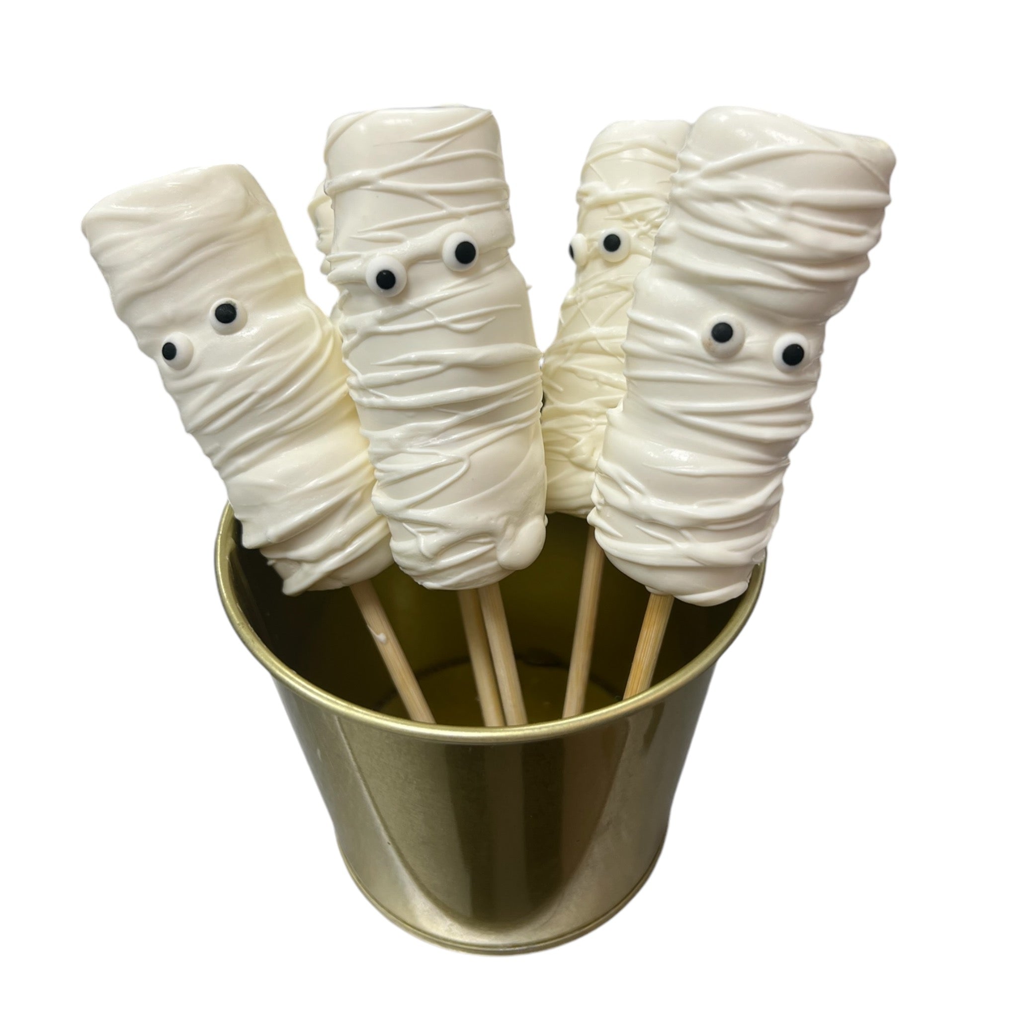 Indulge in our spooky yet sweet white chocolate Halloween marshmallows. Each fluffy marshmallow is coated in creamy white chocolate and decorated with whimsical chocolate drizzle and candy eyes. Perfect for Halloween festivities, these treats combine delightful flavours with a fun, festive twist that’s sure to enchant both kids and adults alike. Enjoy a bite of sweetness wrapped in a spooky surprise!