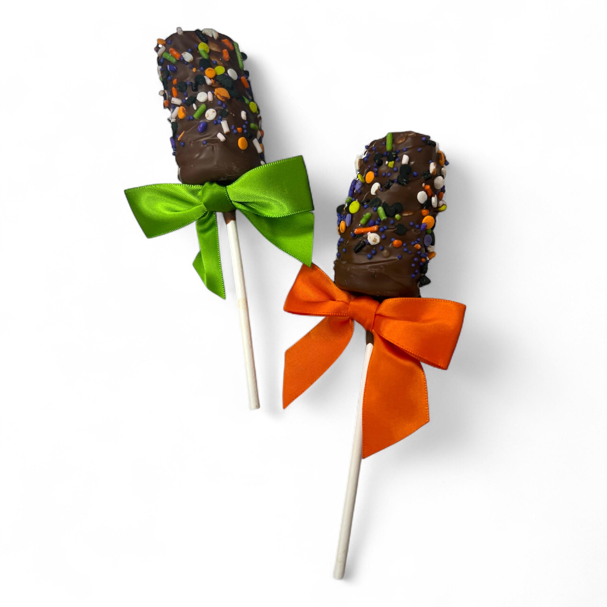 Gooey marshmallows hand dipped in pure milk chocolate and sprinkled with colourful candy pieces. A perfect item for gift bags or for snacking.