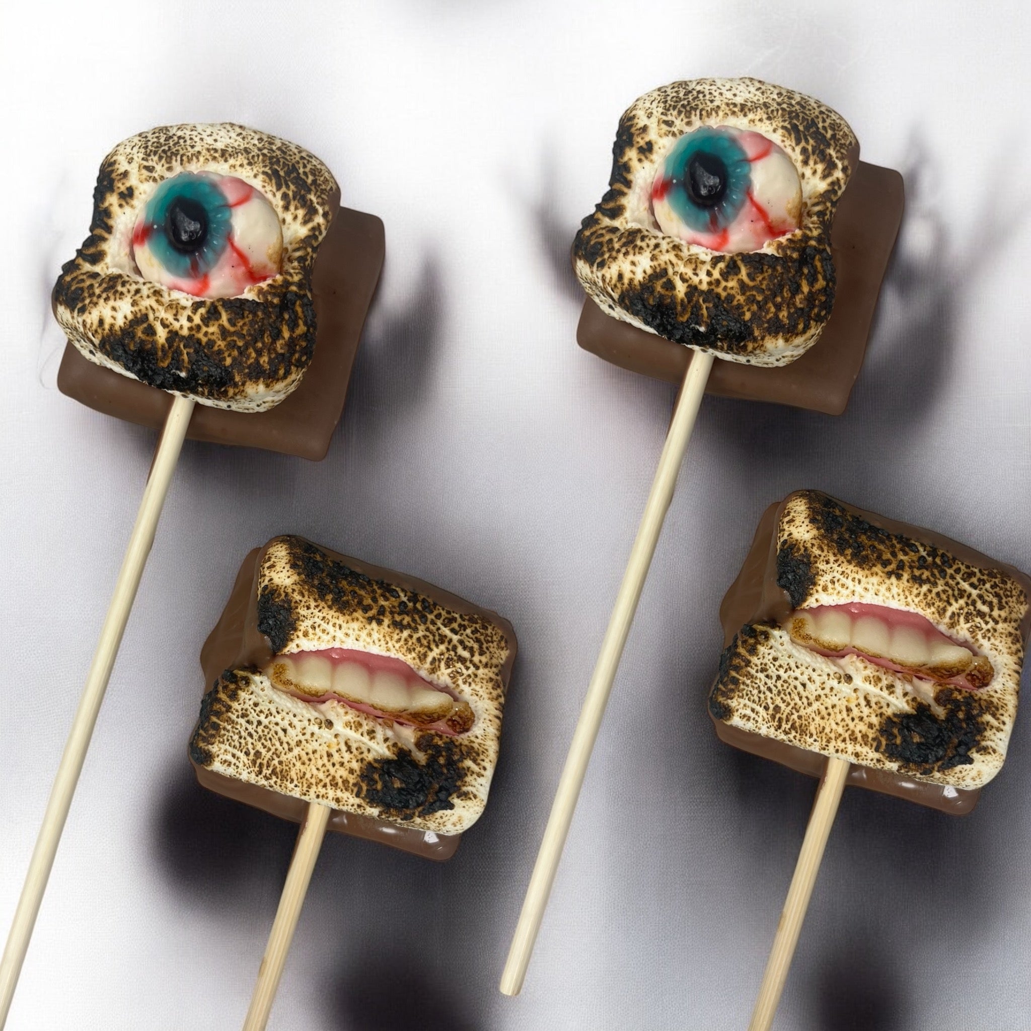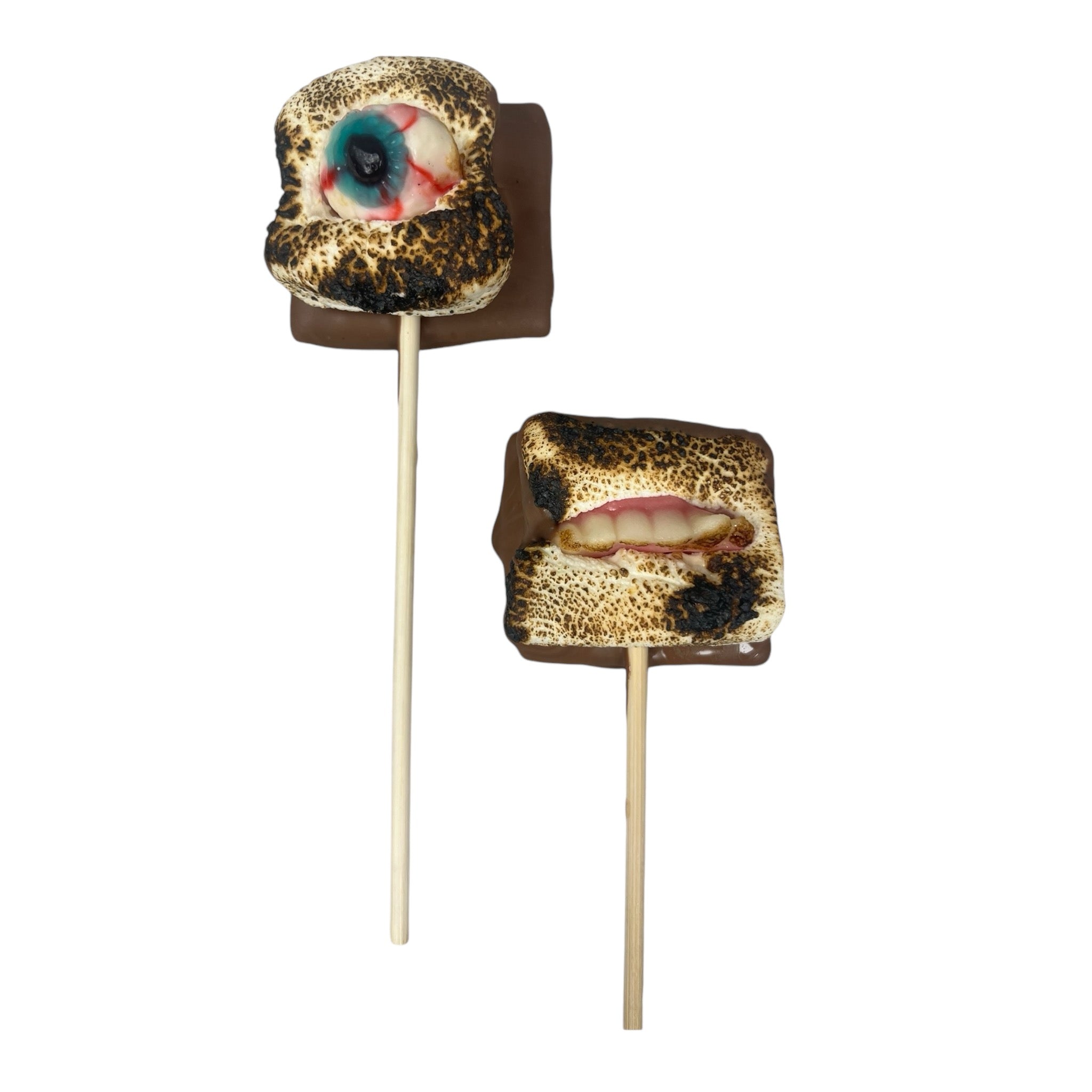 Introducing our house-made spooky Halloween s’mores pops! These delightful treats feature touched marshmallows backed with a graham cracker dipped in velvety milk chocolate, capturing the essence of classic s’mores with a Halloween twist. Each pop is adorned with and eerie candy. Perfectly portable and deliciously fun, these s’mores pops are sure to be a hit at any Halloween gathering, adding a touch of spooky sweetness to your festivities!