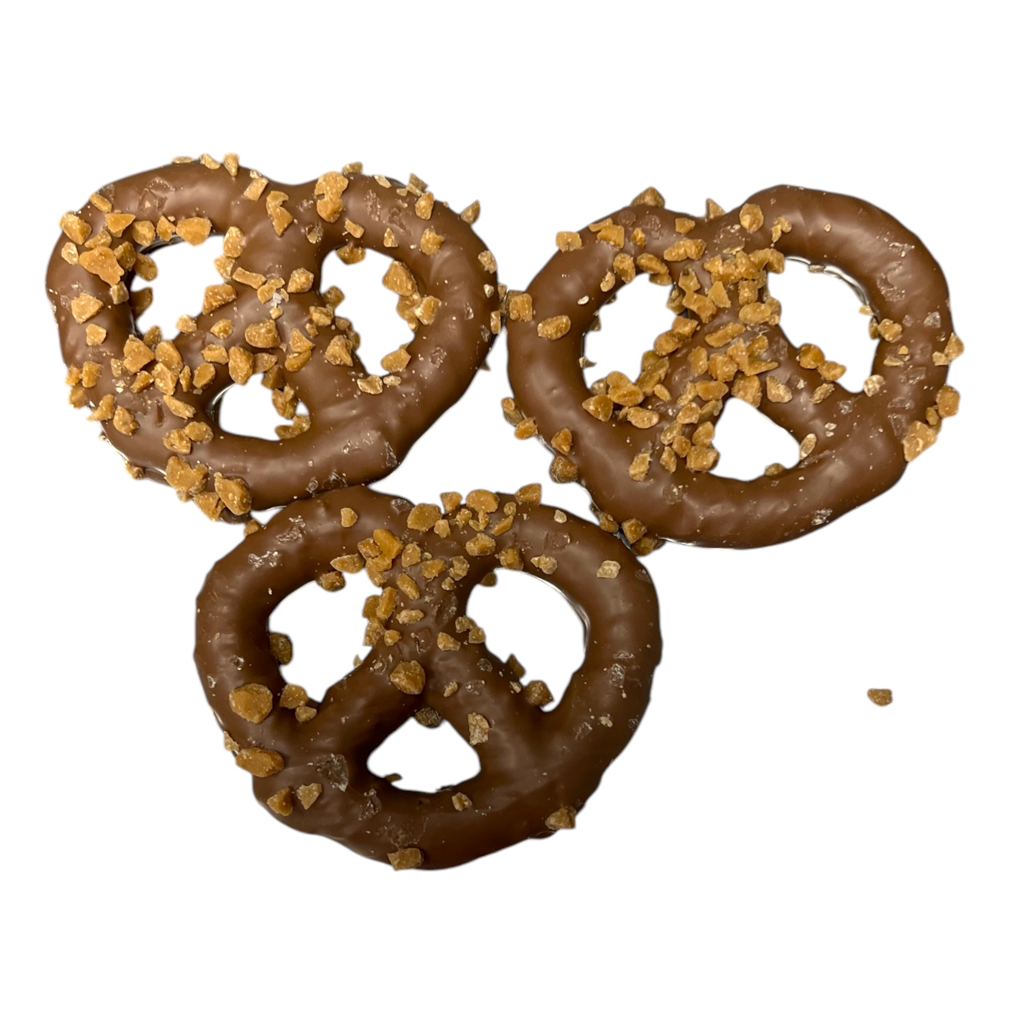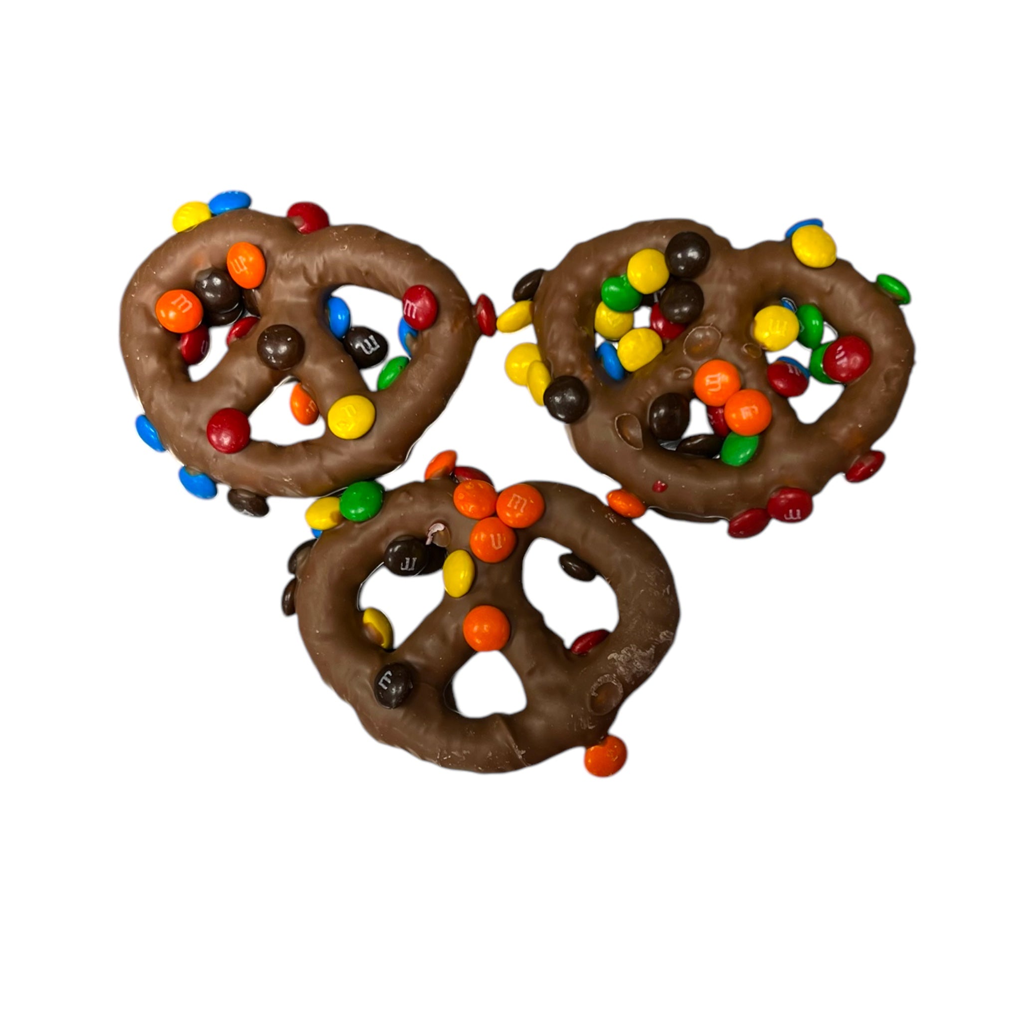 Take our slow baked salted 3 ring pretzel and cover them in our signature milk chocolate. But wait, we top it with mini M&M's or some tasty Skor Bits