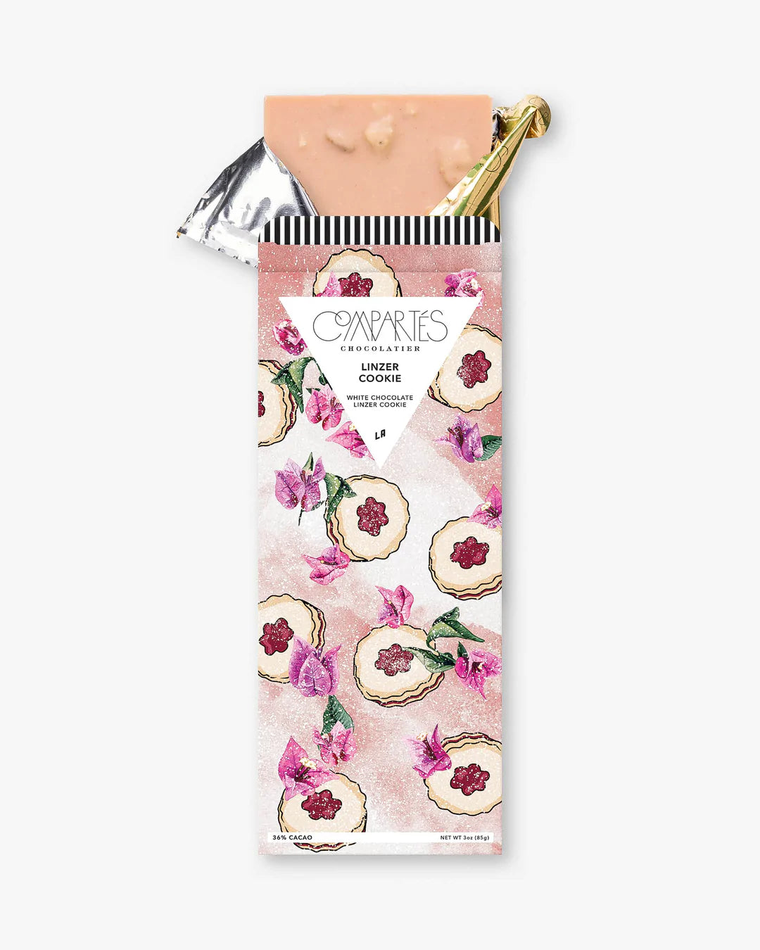 Brand new limited edition Linzer Cookie Chocolate bar, perfect for the holidays and beyond. A chocolate bar infused with tons of pieces of homemade linzer cookies and raspberry preserves. Featuring gorgeous light pink graphics and linzer cookies, powdered sugar as snow and bougainvillea on this beautiful eye catching packaging. Yummmmmyy!!!