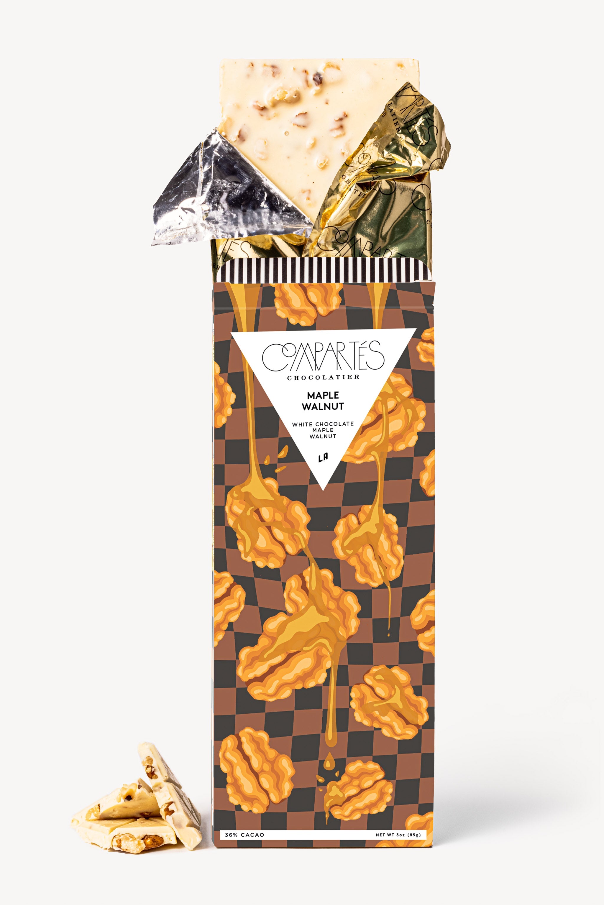 Compartés Maple Walnut chocolate bars are made with white chocolate premium Vermont maple syrup and pieces of crunchy fresh California Walnuts. This sweet nutty and delicious chocolate bar is a limited edition with brand new packaging featuring walnuts, maple and a checkerboard pattern.