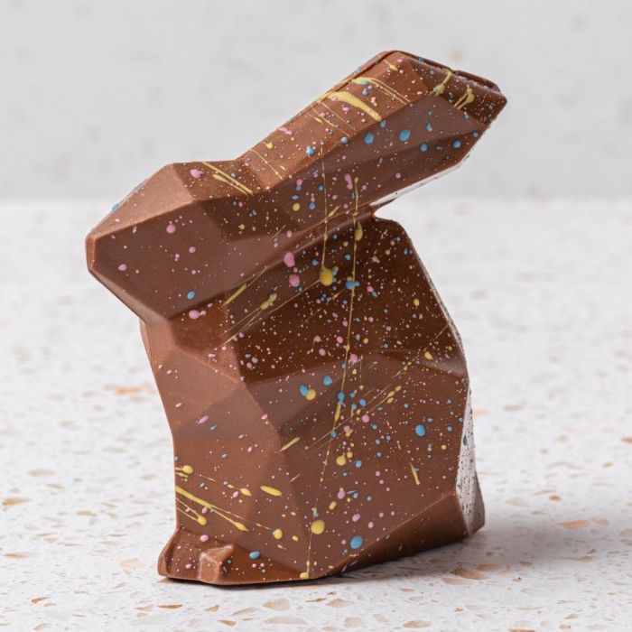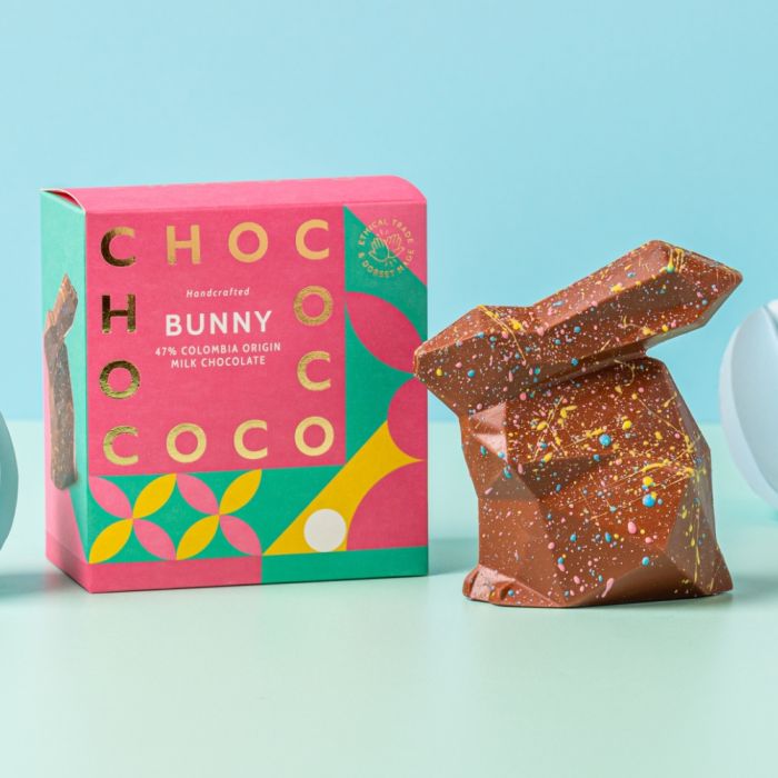 An Easter Bunny with a difference! This 47% Colombia-origin milk chocolate bunny will be loved by everyone. Award-winning signature milk chocolate is made exclusively for Chococo, Hand-decorated with natural colours. Bunny stands 12cm tall
