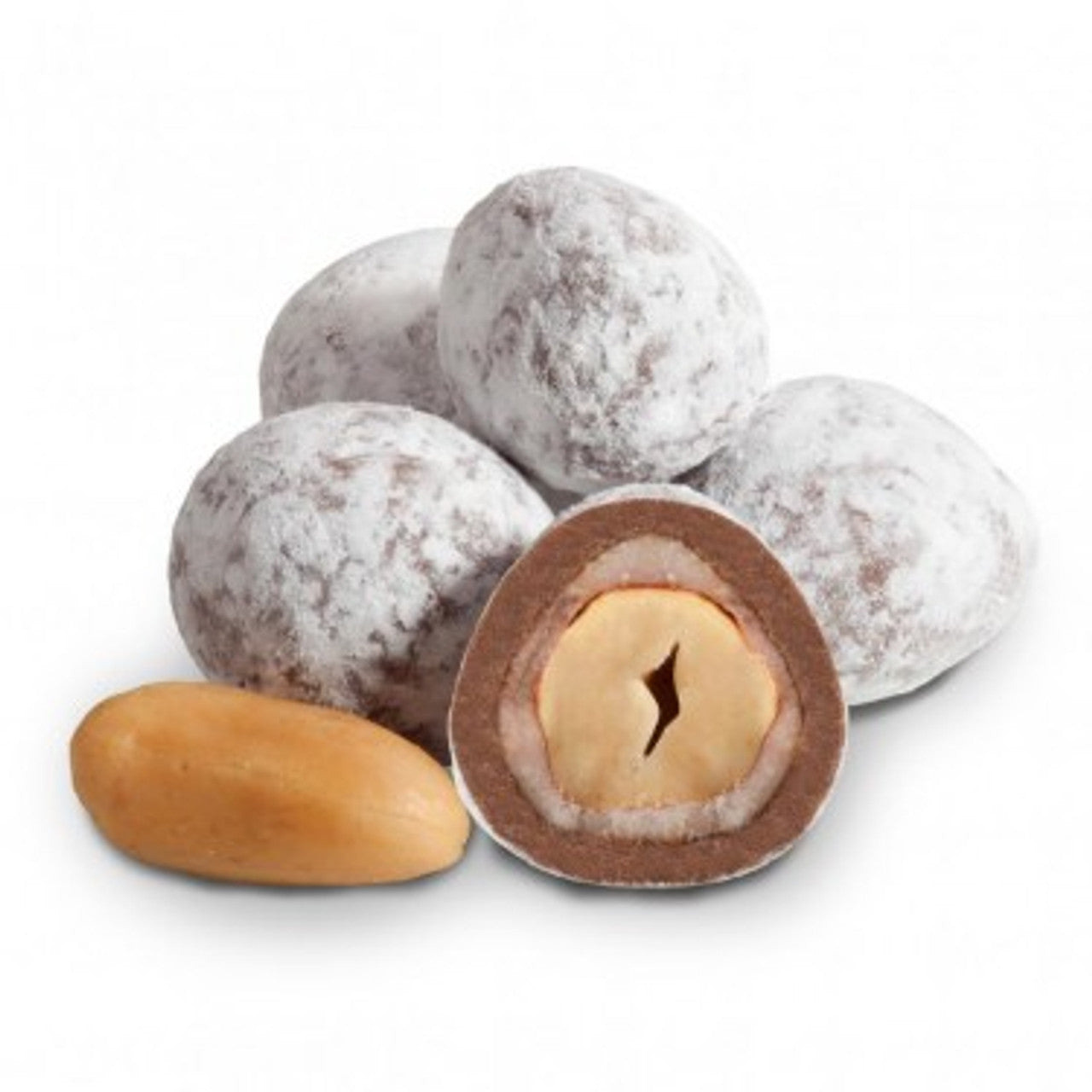 Lightly salted peanuts rolled in toffee, covered in milk chocolate and dusted with powdered sugar.