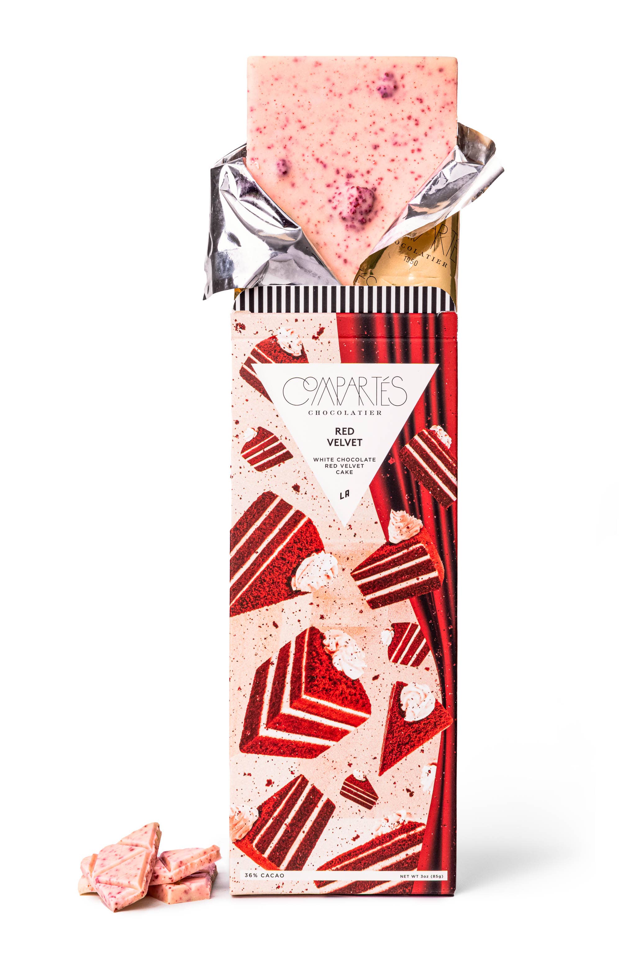 Compartes Red Velvet Chocolate Bar is finally here, the fans voted, we listened! Filled with pieces of homemade red velvet cake and decadent cream cheese frosting, meet your new favorite bar. We handcraft our red velvet cake crumbs from scratch and infuse this delicious cream cheese laced bar with tons and tons of pieces of homemade red velvet crumb. This might be our BEST bar yet!