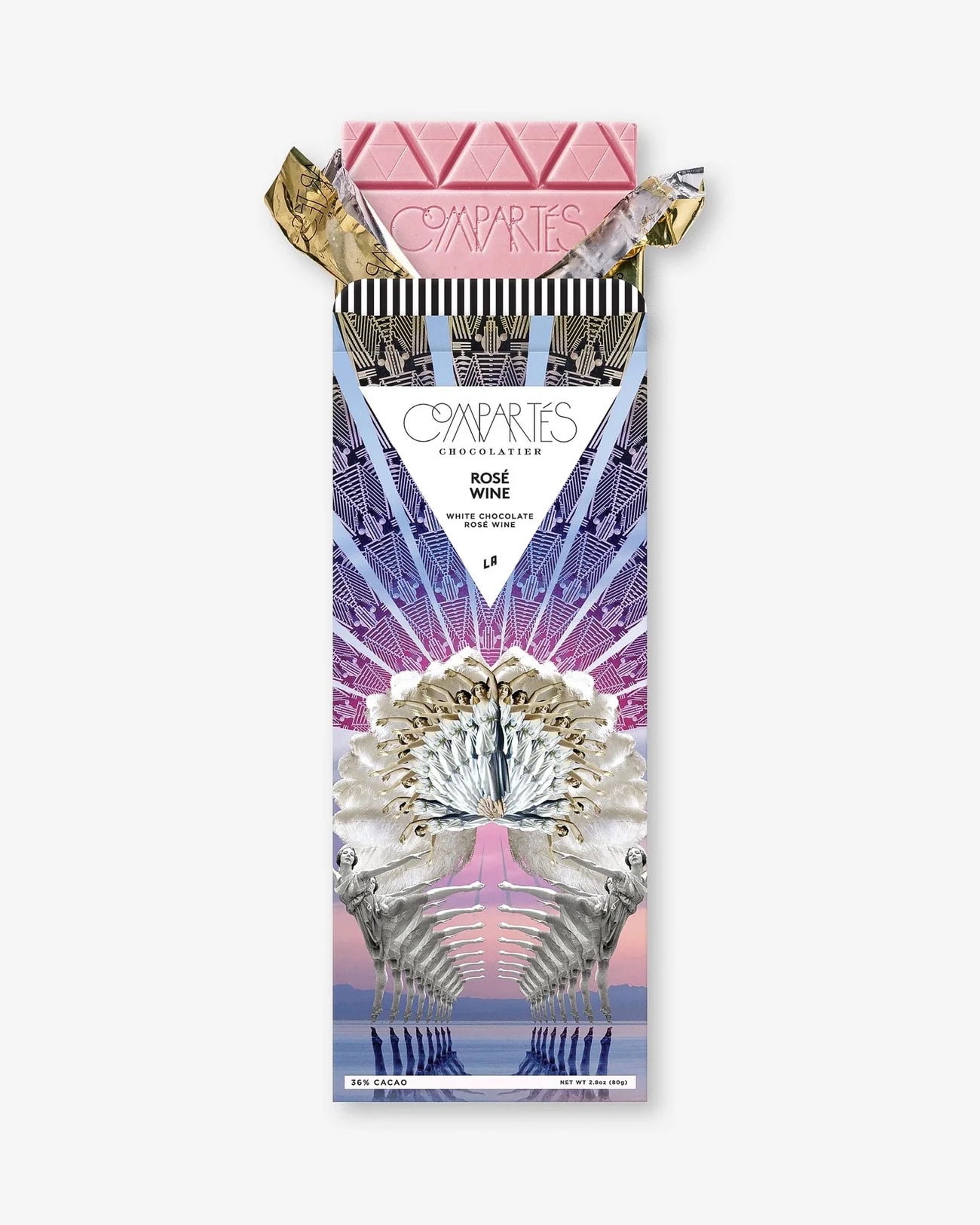 Indulge in our Rosé Wine Chocolate Bar, a creamy chocolate bar infused with rosé wine, for a sophisticated, melt-in-your-mouth experience. Featuring a stunning pink-hued chocolate bar and beautiful art-deco inspired packaging, this bar is as beautiful as it is delicious. Sip, savour, and indulge in this dreamy, delicious chocolate + wine pairing.