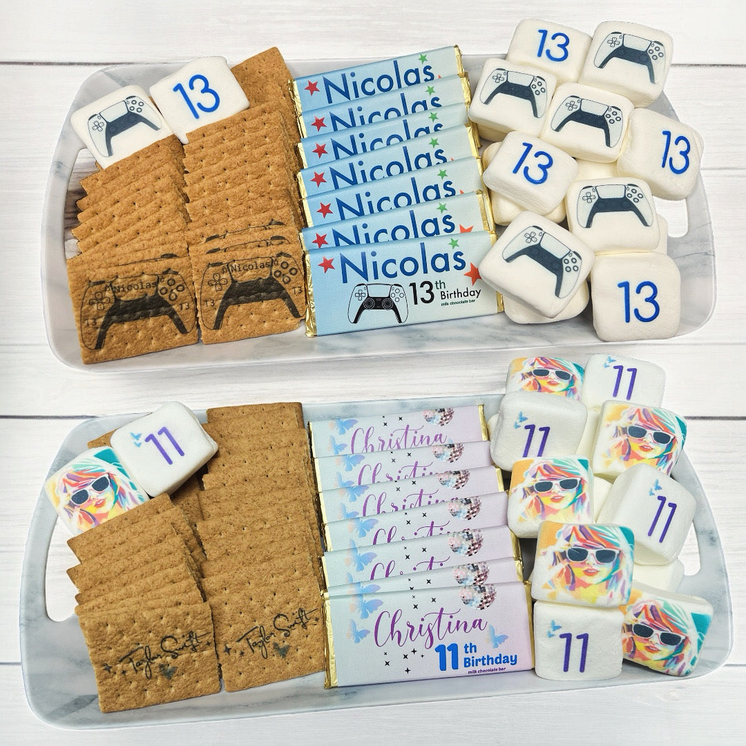 It’s PARTY Time !! Celebrate with a Custom S’mores Platter. Cottage Getaways, Backyard Summer Nights, Graduations and Birthdays Party all will be a little sweeter !! Milk Chocolate Bar, with Marshmallows and Graham