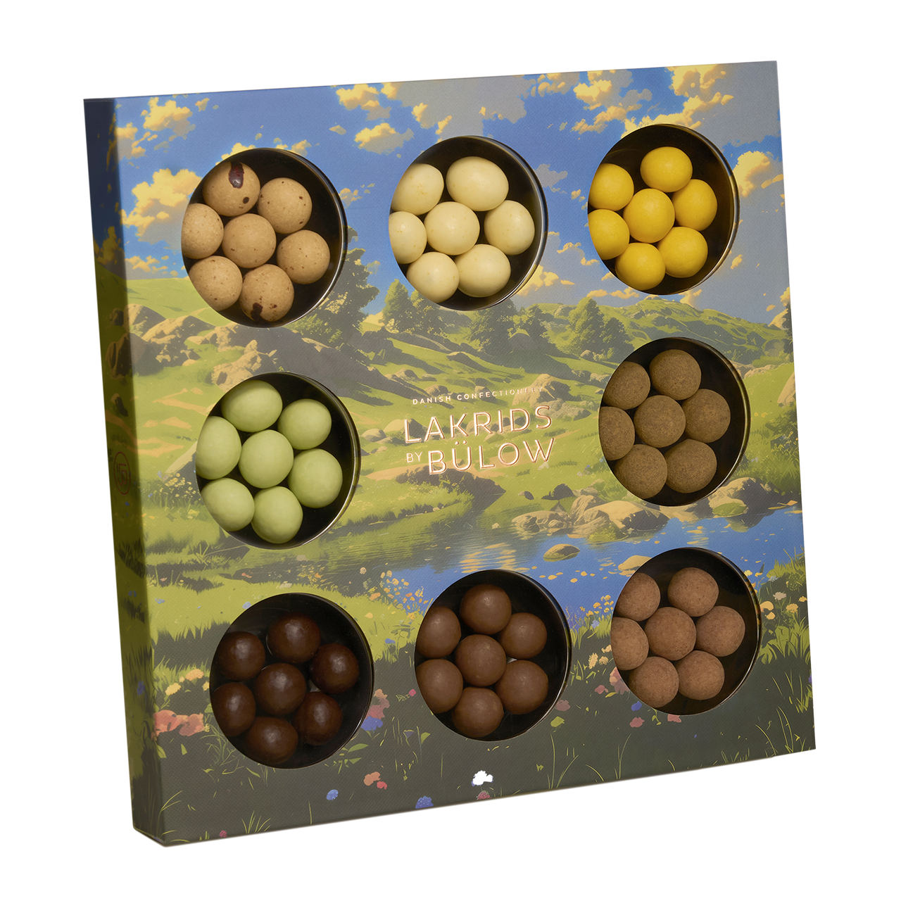 Finally, it is time to celebrate the return of the light as the sun melts away the last bit of winter snow. Beautiful, blooming anemones, sprouts covering the forest in a white dream while birds are singing joyfully from the trees above. This year we have gathered CRISPY CARAMEL, CRUNCHY TOFFEE, A - THE ORIGINAL, B - PASSION FRUIT, D - SALT & CARAMEL, F - DARK & SEA SALT, LÆMON and SOUR STRAWBERRY and we think the SPRING SELECTION BOX is the perfect way to welcome spring.