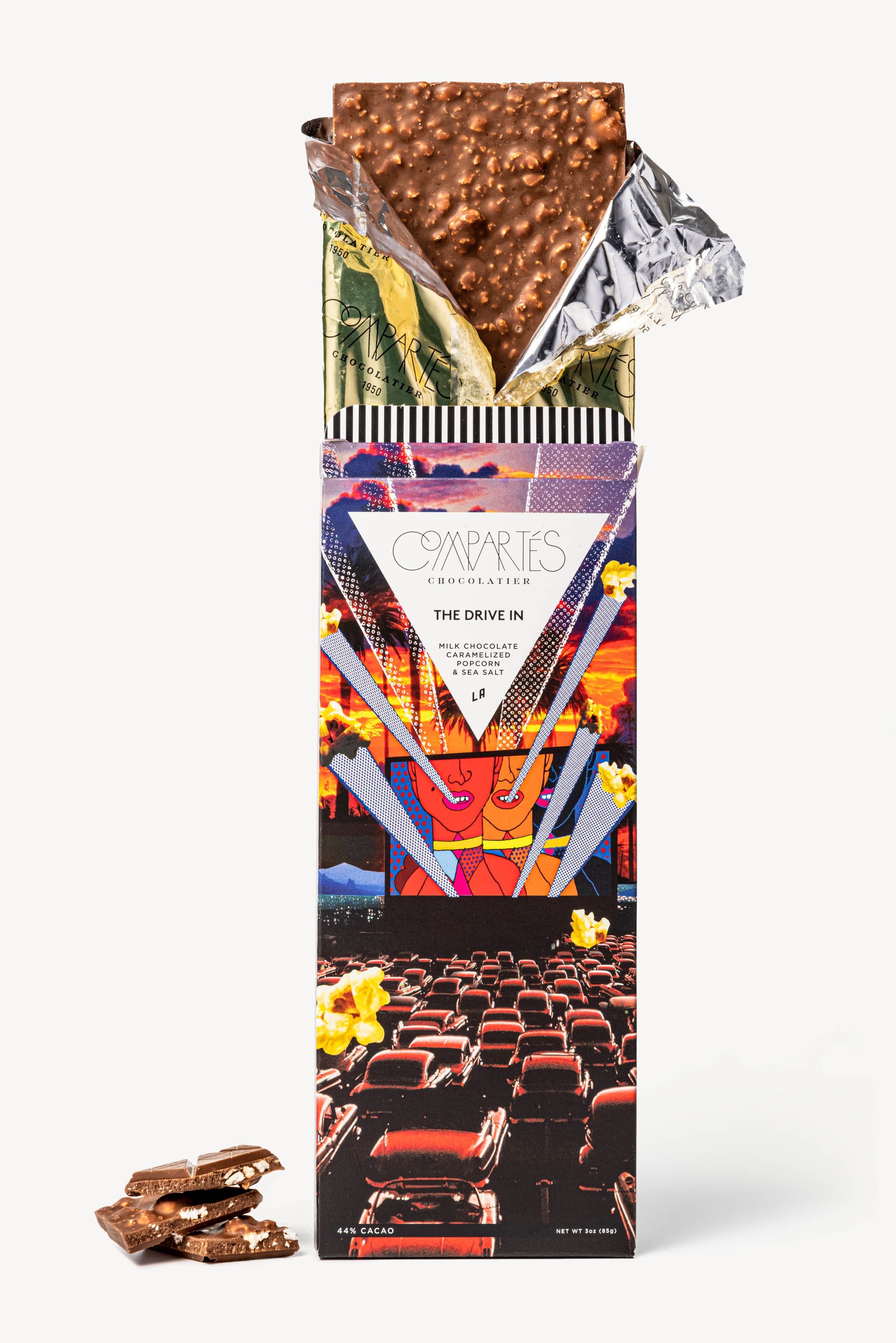Compartés gourmet milk chocolate and popcorn Drive In bar takes you to the movie theatre with just one bite. Made with our traditional candy corn, kettle corn and caramelized movie popcorn all crunched up and drenched in our signature milk chocolate. If you go to the movie theatre and mix your chocolate with your popcorn, this chocolate bar is for you! Features a drive-in movie theatre mixed with Los Angeles Hollywood iconic on the packaging. 84g