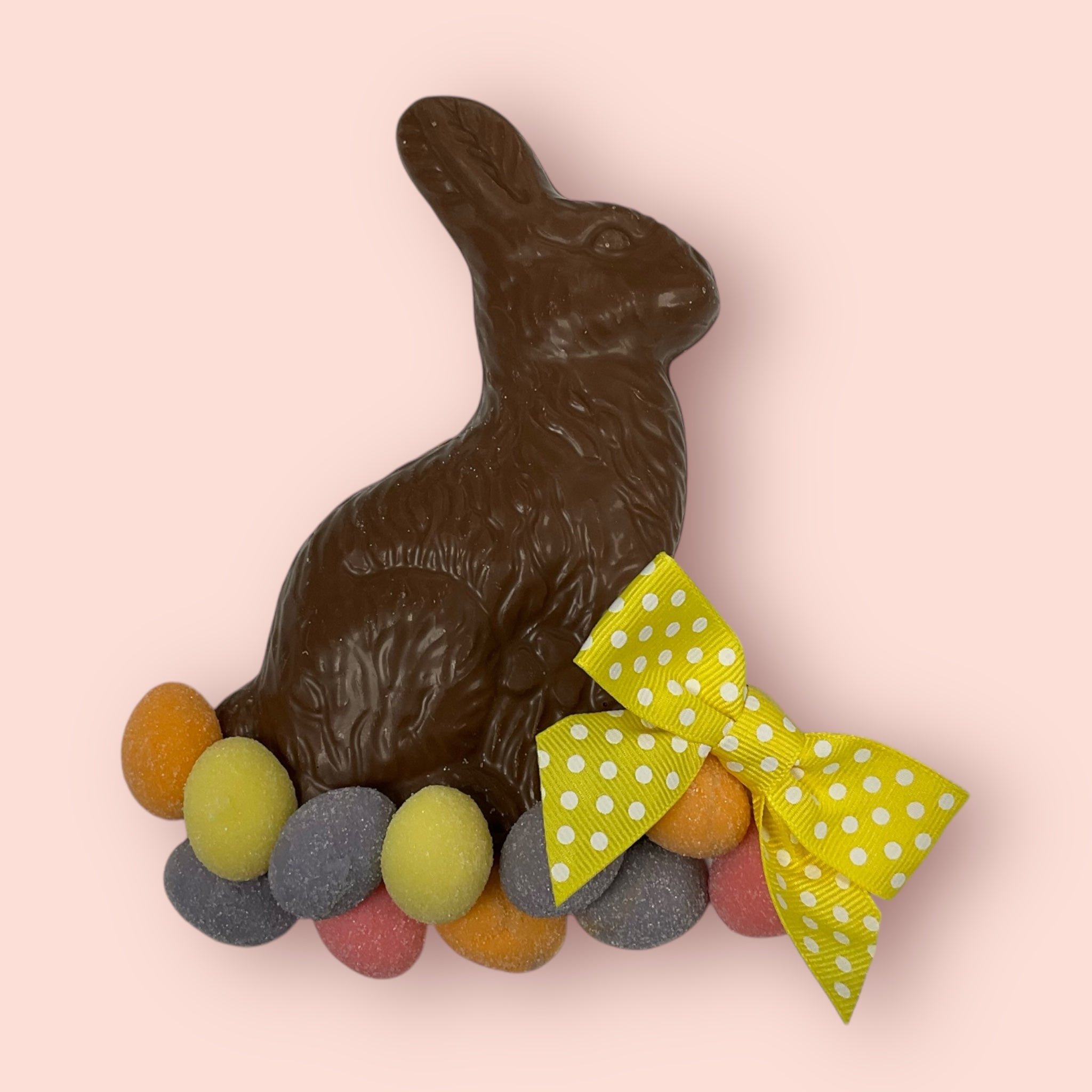 Made with Pure Belgium Milk Chocolate, 6” Traditional Easter Bunny paired with Gummy Easter Eggs