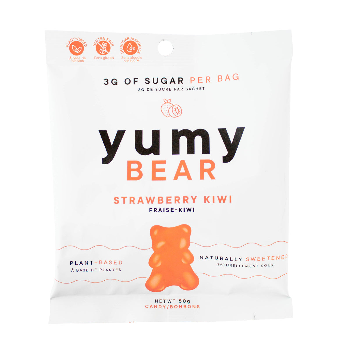 Yumy Bear is the perfect grab-and-go snack to curve your sweet tooth! Snack with confidence knowing our candy is made with only 3 grams of sugar, 115 calories, and plant-based ingredients. Our Strawberry Kiwi flavour is a fruity delight for all to enjoy! 50g